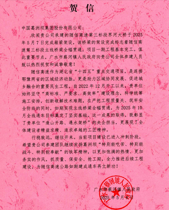 5月8日,随信高速三标项目部收到广水市蔡河镇政府贺信。信中,对随信三标项目部界河大桥双幅贯通表示亲切的问候并致以衷心的祝贺。