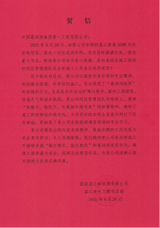 6月26日,盈江新莲光伏发电EPC总承包项目收到业主单位国能盈江新能源有限公司发来的贺信。信中对盈江新莲50MW光伏发电项目圆满完成首次一次性成功并网发电目标表示热烈祝贺,并向奋战在施工现场的项目管理团队及全体施工人员表示衷心感谢。