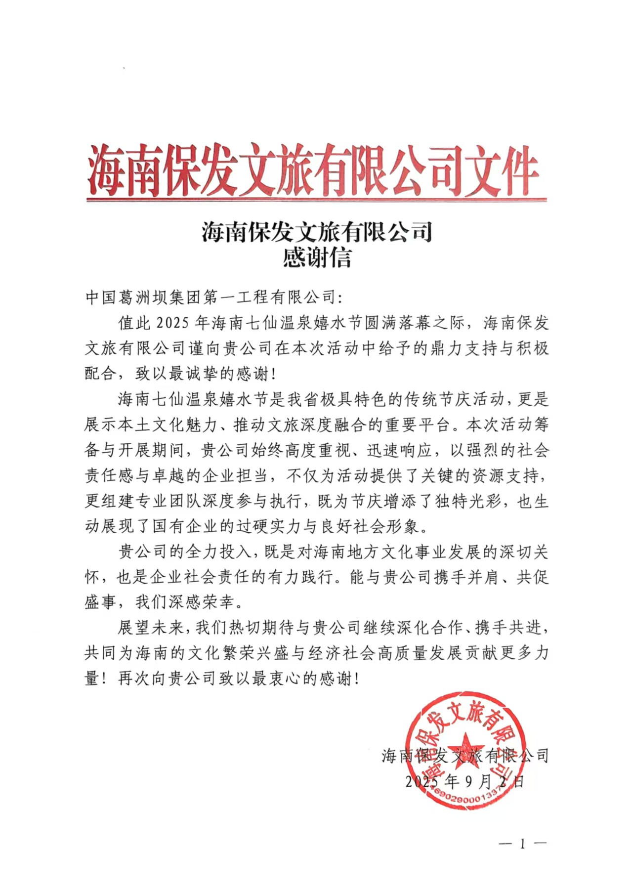 近日,海南热带果蔬科创基地项目部收到海南保发文旅有限公司的感谢信。信中对项目部在2025年海南七仙温泉嬉水节活动中给予的宝贵支持表示衷心的感谢。