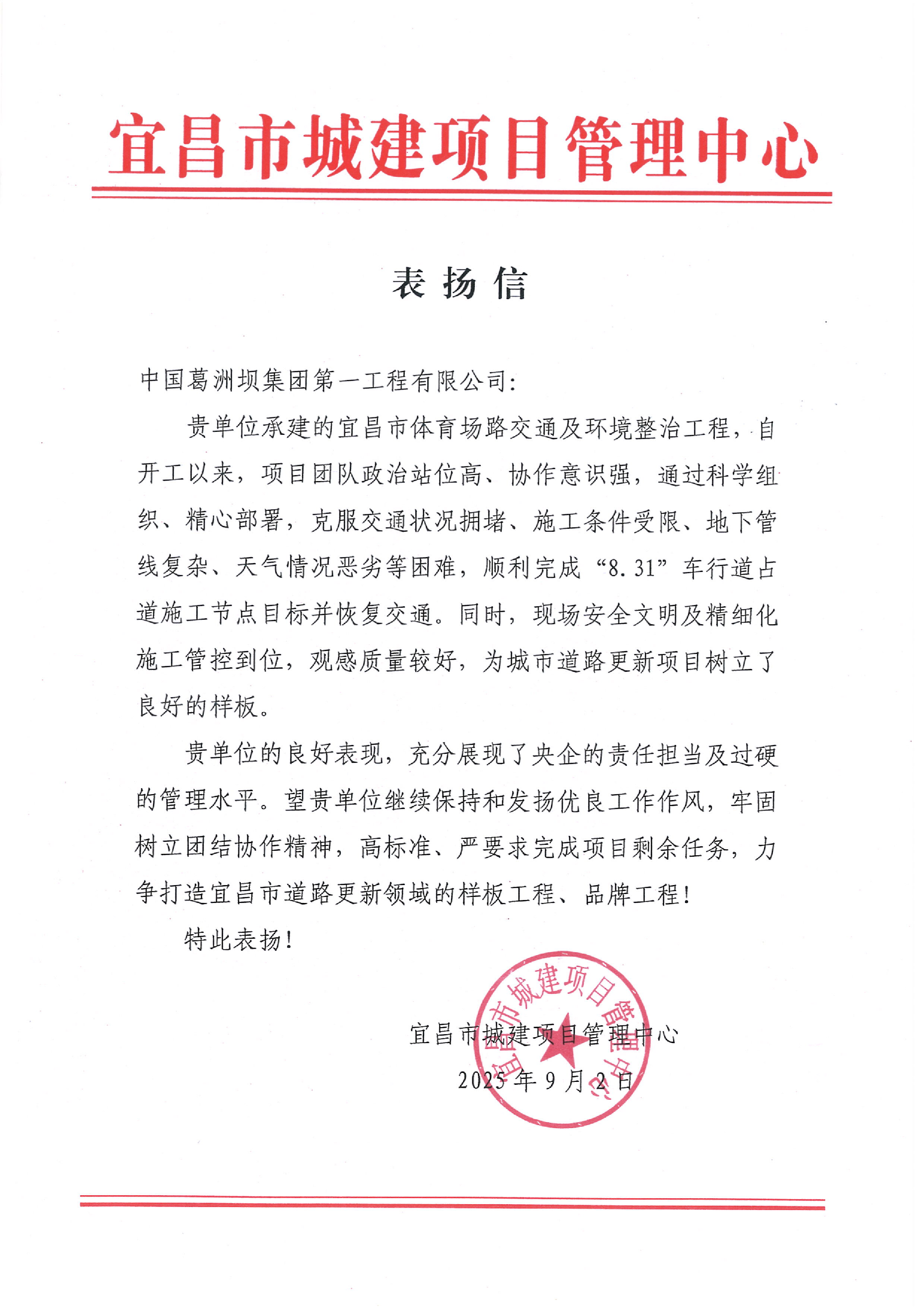 近日,宜昌体育场路项目部收到宜昌市城建项目管理中心表扬信。